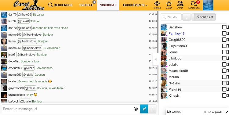 C’est sans doute la fonctionnalité phare de Carré Libertin. Elle permet de rejoindre un tchat en visio, où il est possible de voir et de se montrer.